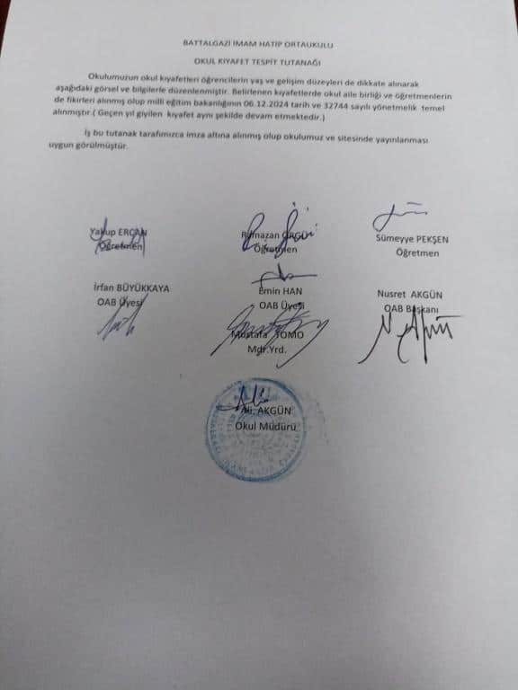 2025–2026 eğitim öğretim yılında okulumuzda öğrenim görecek öğrencilerimizin okulda giyeceği kıyafetler belirlenmiştir. Kılık-kıyafet düzeni, okul kültürünün ve disiplini sağlamanın önemli bir parçasıdır. Bu kapsamda öğrencilerimizin birlik ve beraberlik duygusunu pekiştirmek, okul aidiyetini artırmak ve öğrencilerimiz arasında eşitlik duygusunu geliştirmek amacıyla okul kıyafetlerinde belirli standartlara uyulması önem arz etmektedir.